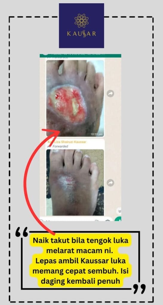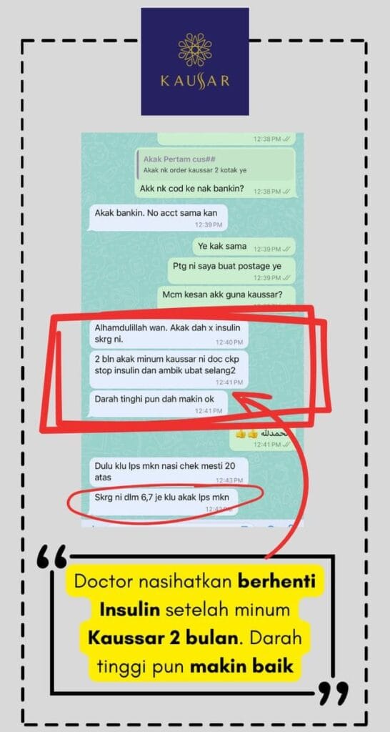 ” Sebelum ambil Kaussar bacaan gula 15.8, rasa kebas-kebas dan cepat kencing. Lepas ambil Kaussar 2 kotak bacaan gula mantain 5-7, walau lepas makan” Akmal