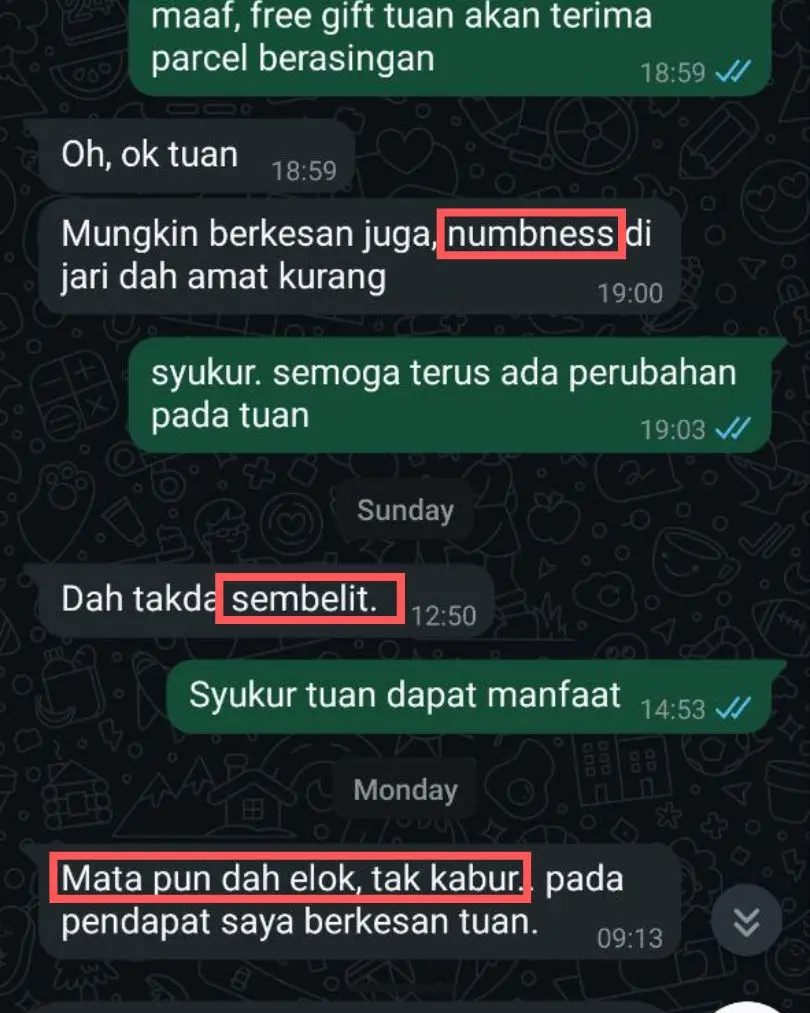 ” Bengkak hitam, Kebas kaki, kebas tangan dah tak ada. Nak travel malam pon dah boleh. Mata dah cerah dan bermaya” Azam Bakti, Kluang